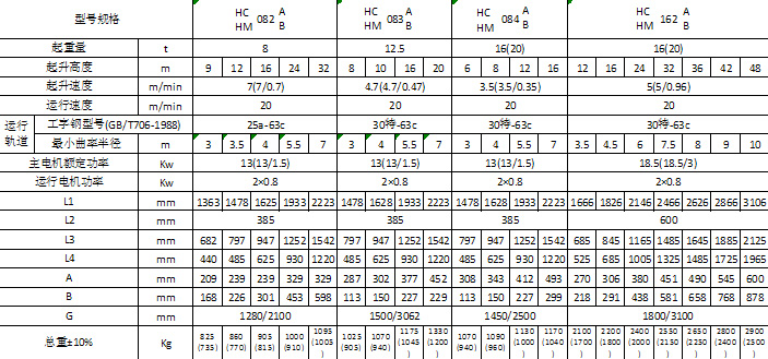 HC、HM型系列電動葫蘆是以08型與16型組成的一種新型大噸位電動葫蘆,通過滑輪組倍率和電機的變換,可以組合到能夠滿足各種場合使用的起吊設(shè)備。