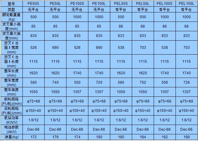 無錫虎力PE型電動(dòng)剪式升高液壓搬運(yùn)(平臺(tái))車技術(shù)參數(shù):