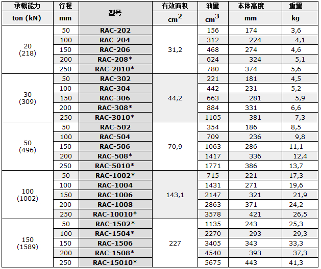 恩派克RAC系列單作用鋁制油缸參數(shù):